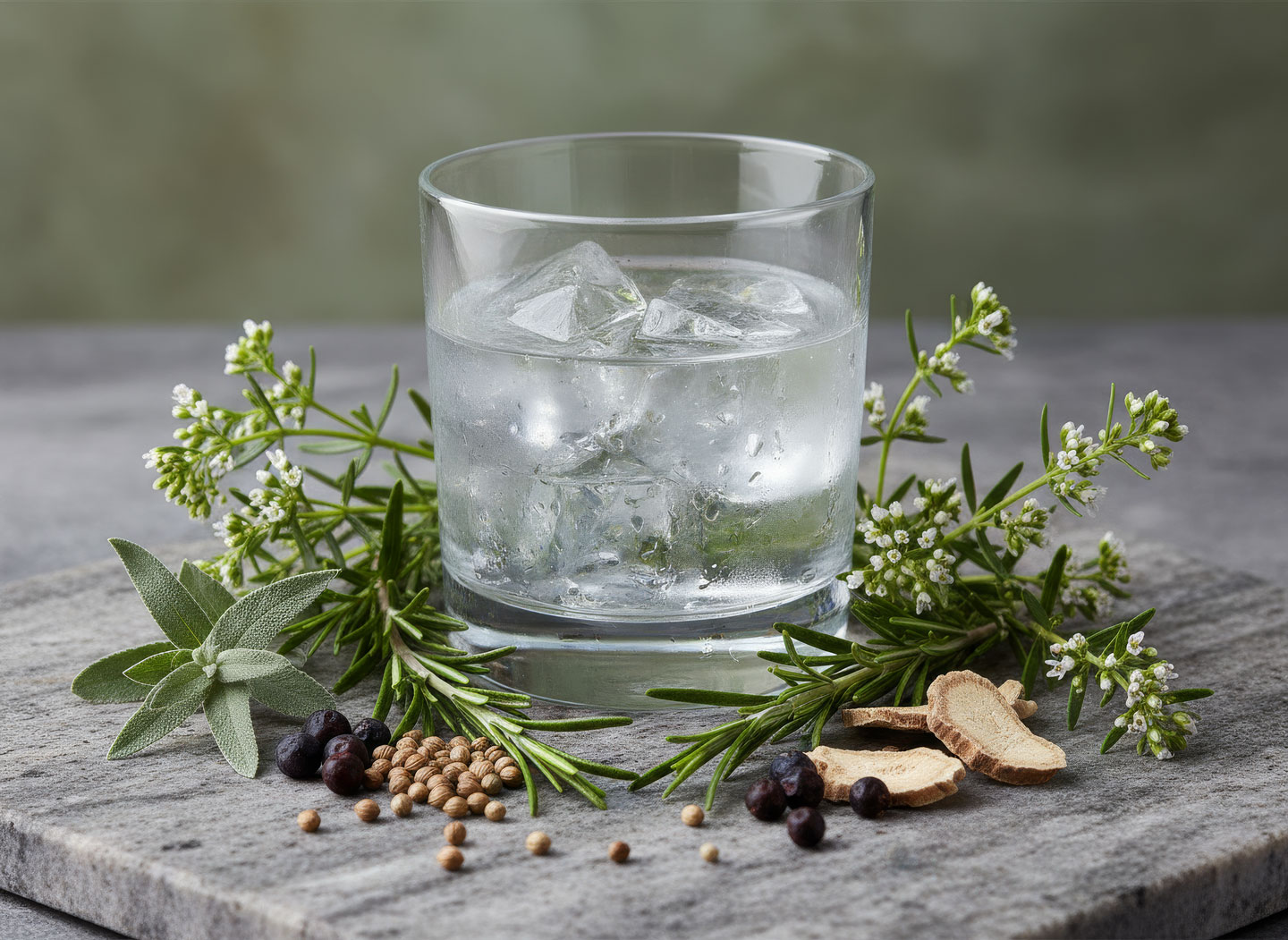 Ginebra con hielo, sin excesos, y una ramita de romero fresco para potenciar su perfil herbal.